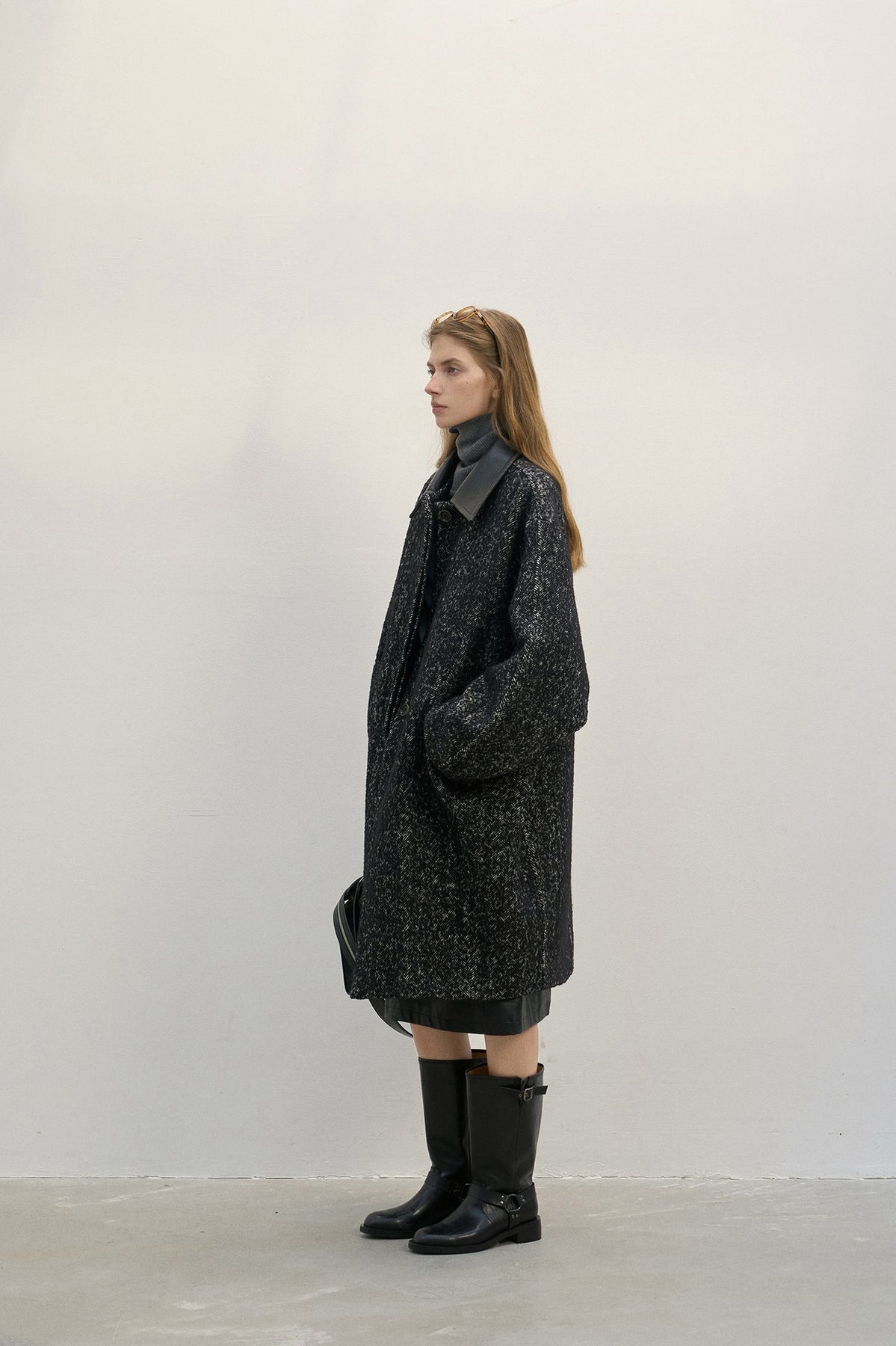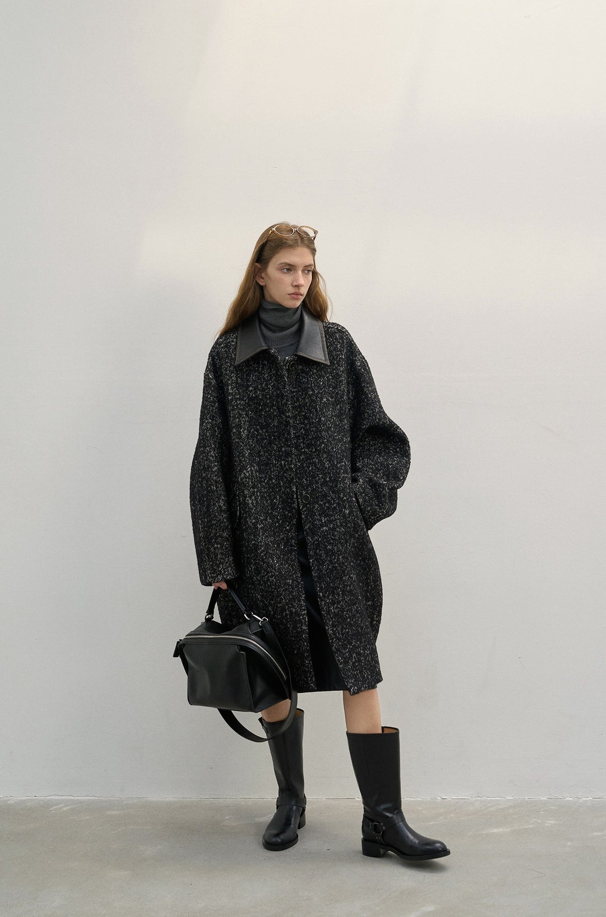 Oversized Wool Coat with Contrast Leather Collar